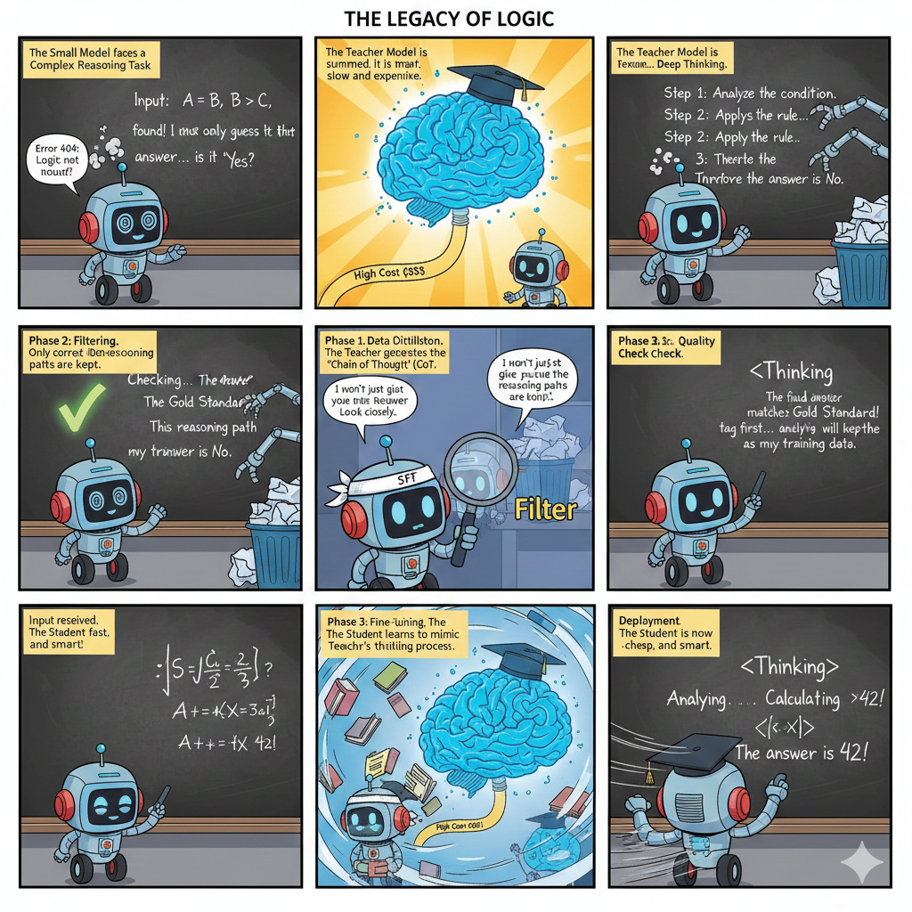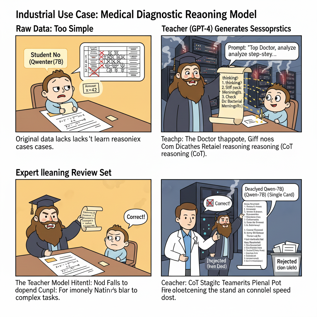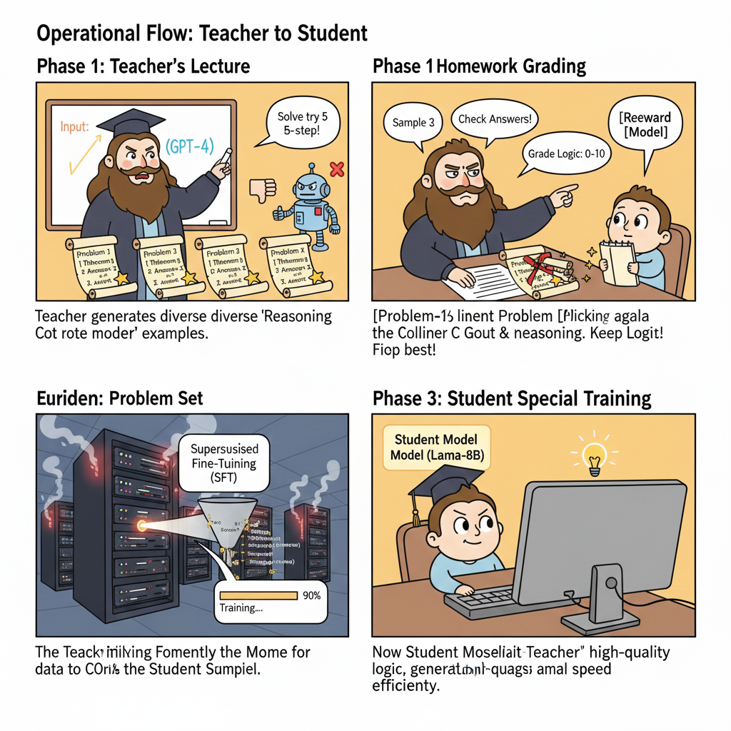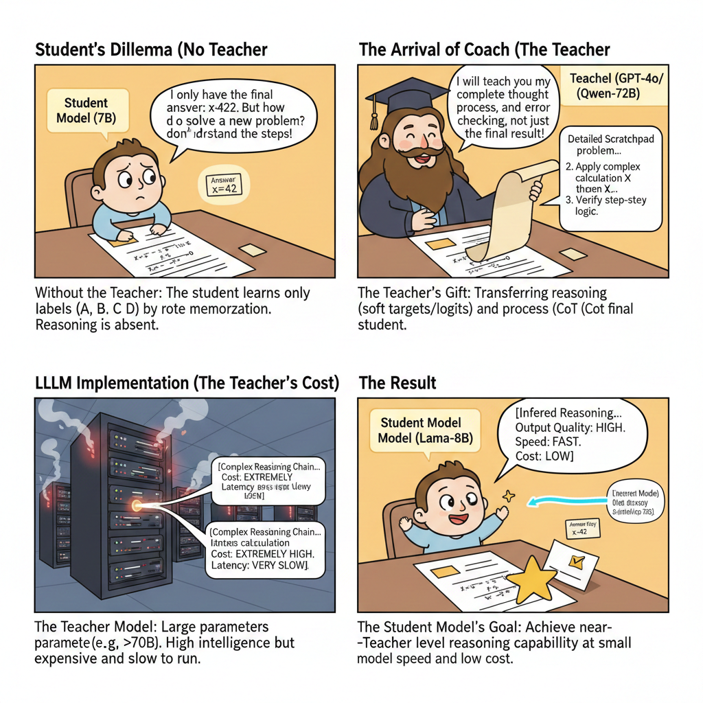 - Teacher-Student 模式: 你找了一位奥数金牌教练(Teacher Model,如 GPT-4o 或 DeepSeek-R1)。教练不仅告诉你答案,还给出了详细的解题思路、推导步骤、甚至排查错误的逻辑。