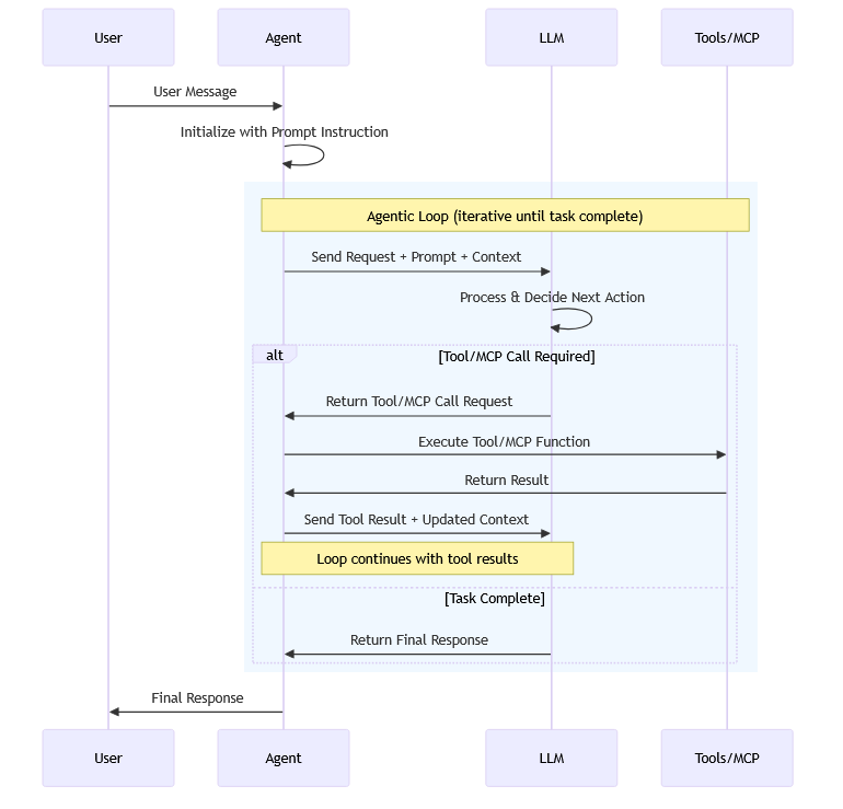 AI 代理使用 LLM 来处理用户输入、做出决策、调用工具和MCP 服务器来执行作,并生成响应。 下图演示了 AI 代理中的核心组件及其交互: