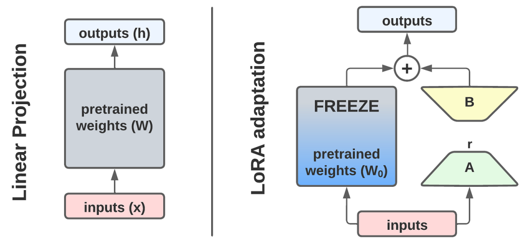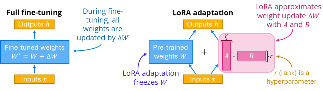 只学A、B两个小矩阵,就能表达一大块改动ΔW。