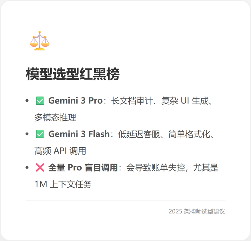 - 拒绝全量 Pro: 简单的格式转换、常规客服问答,直接调 Gemini 3 Flash。Flash 的首 Token 延迟只有 Pro 的三分之一,价格低到可以忽略不计。