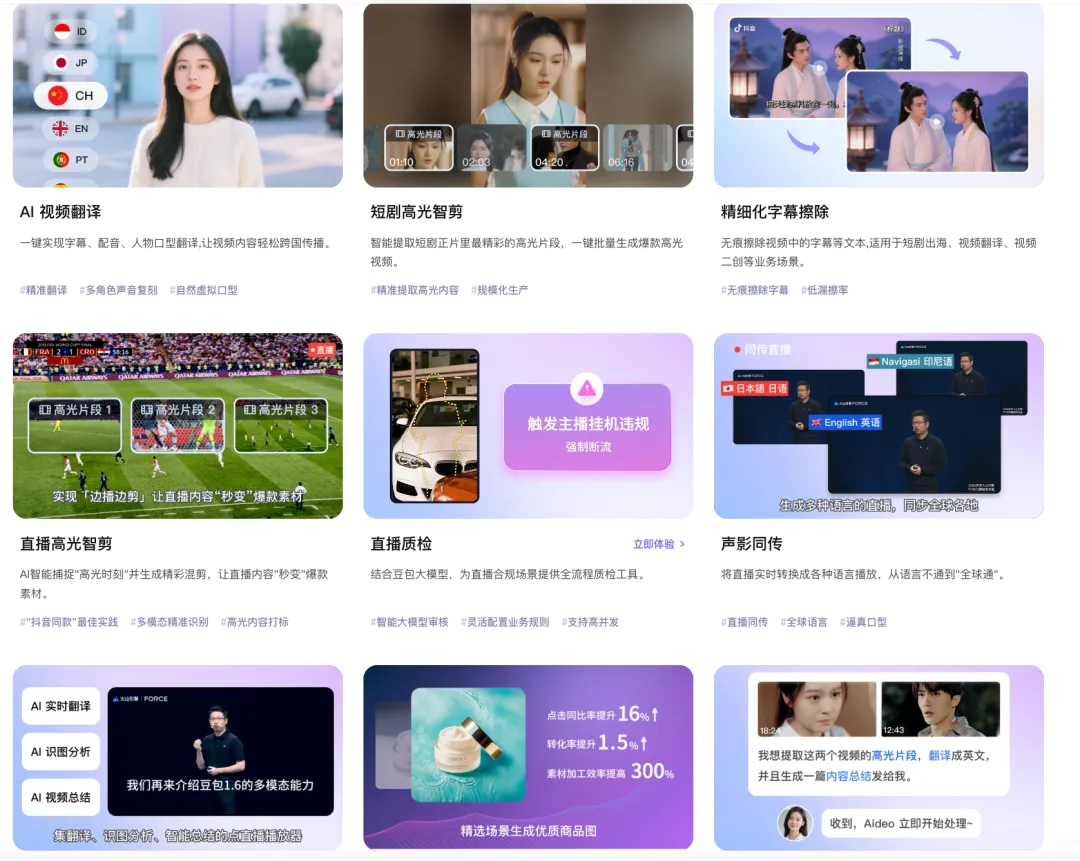 这也是为什么,火山引擎视频云选择将经典能力升级为 AI MediaKit——作为面向 AI 云原生 时代的极致效率工具,AI MediaKit 将原先在抖音、 豆包 等业务中打磨成熟的媒体处理技术,升级成更细粒度的原子能力。这些在视频云时代长期积累的媒体处理原子能力,也是火山引擎最核心、也最具竞争力的能力。 在视频理解、AI 推搜、内容二次创作等场景中,AI MediaKit 能够将大模型的多模态理解能力和 AIGC 生成能力引入音视频处理流程,让系统不仅能“看见”和“听见”,还能理解内容含义,从而更好地放大媒体价值。