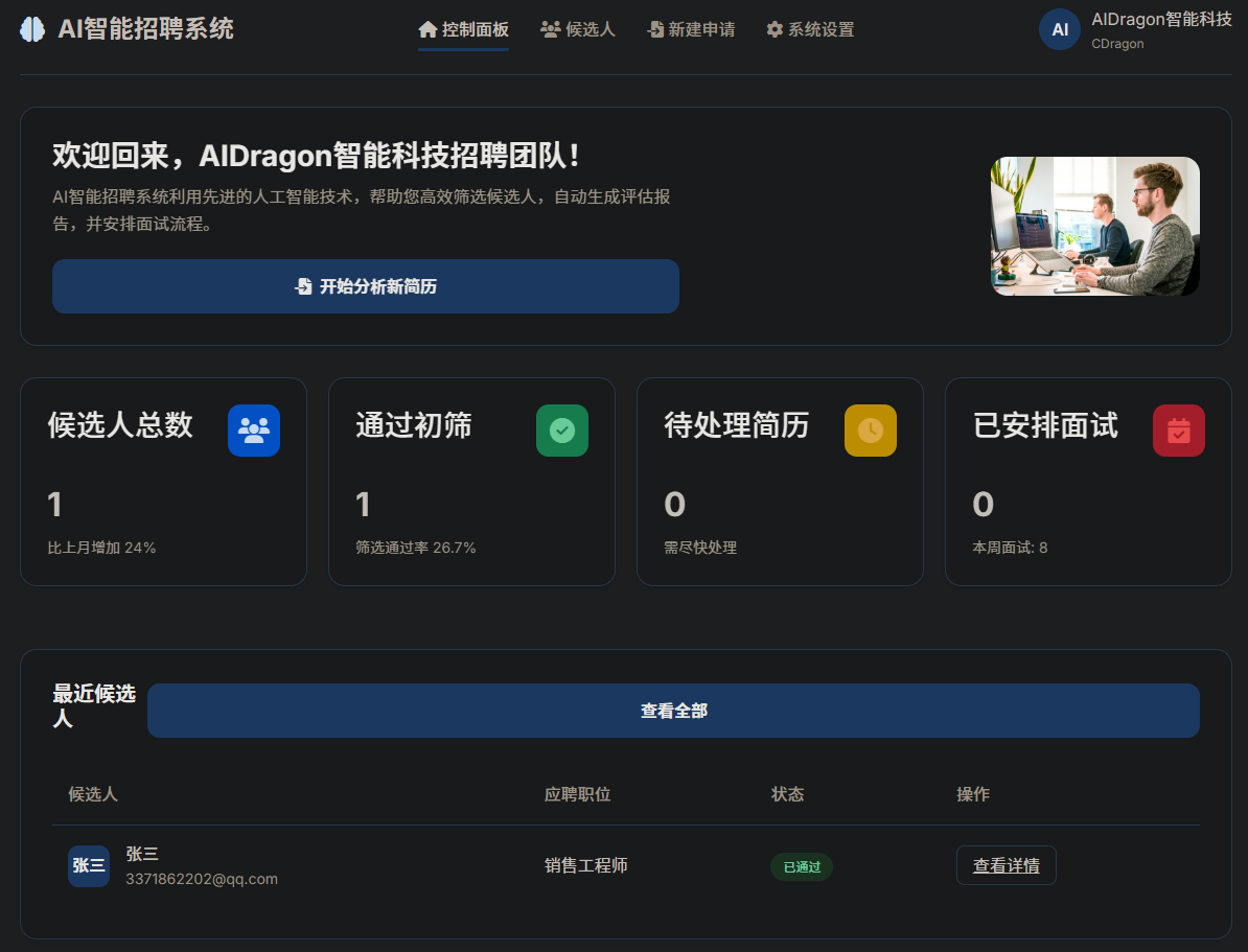 随着 AI 技术的持续迭代,智能招聘将进一步向 “个性化匹配 + 全流程自动化” 方向发展,这套系统为企业提供了一个低成本、高性价比的智能化转型起点。如果需要进一步定制功能或解决部署问题,欢迎在评论区交流!如果需要获取系统完整代码、数据库初始化脚本或部署问题排查指南,可以留言告诉我,我会整理一份完整的资源包分享给大家~也欢迎大家关注公众号&视频号“AICDragon”