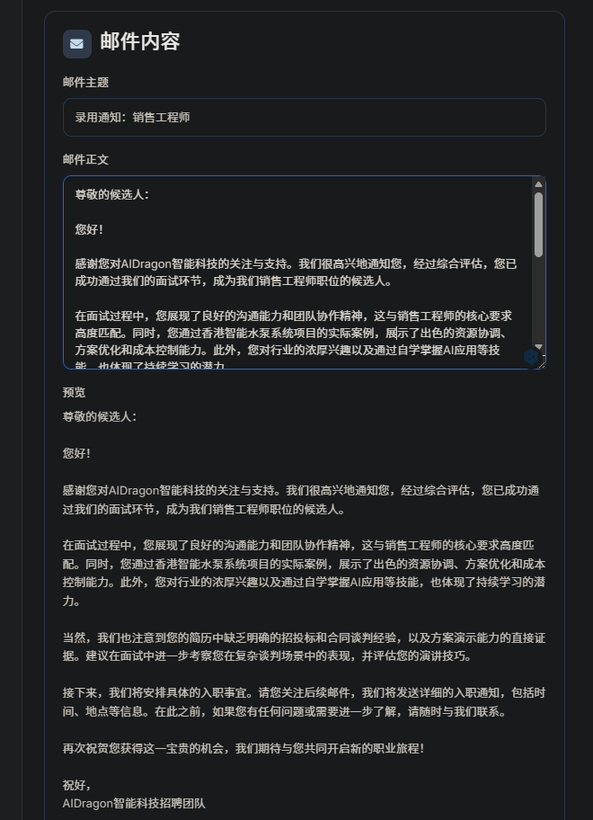可以非常清晰看到,录用通知是成功发送到应聘者的邮箱里的,并且内容与系统里AI生成的是一致的,而且格式和排版上也是接近招聘形式。