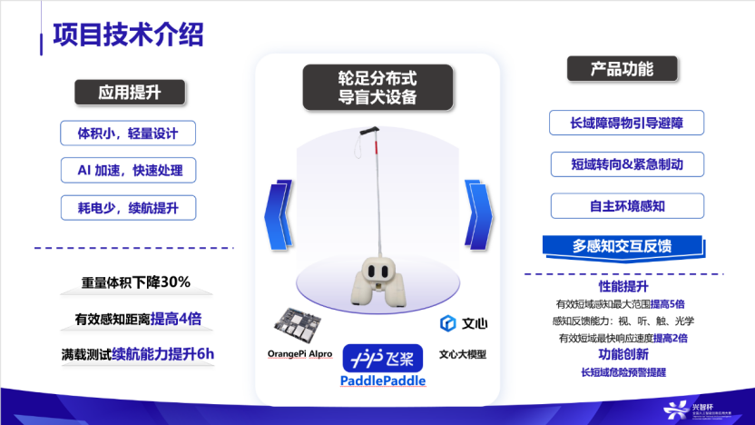 - 系统不仅填补了国内全场景智能导盲设备的技术空白,更推动了飞桨框架与国产算力在无障碍领域的生态落地,其多模态融合架构与边缘智能部署方案可复用至自动驾驶、智能机器人等场景,实现技术外溢与跨行业价值转化,具有显著的社会效益与产业带动作用。