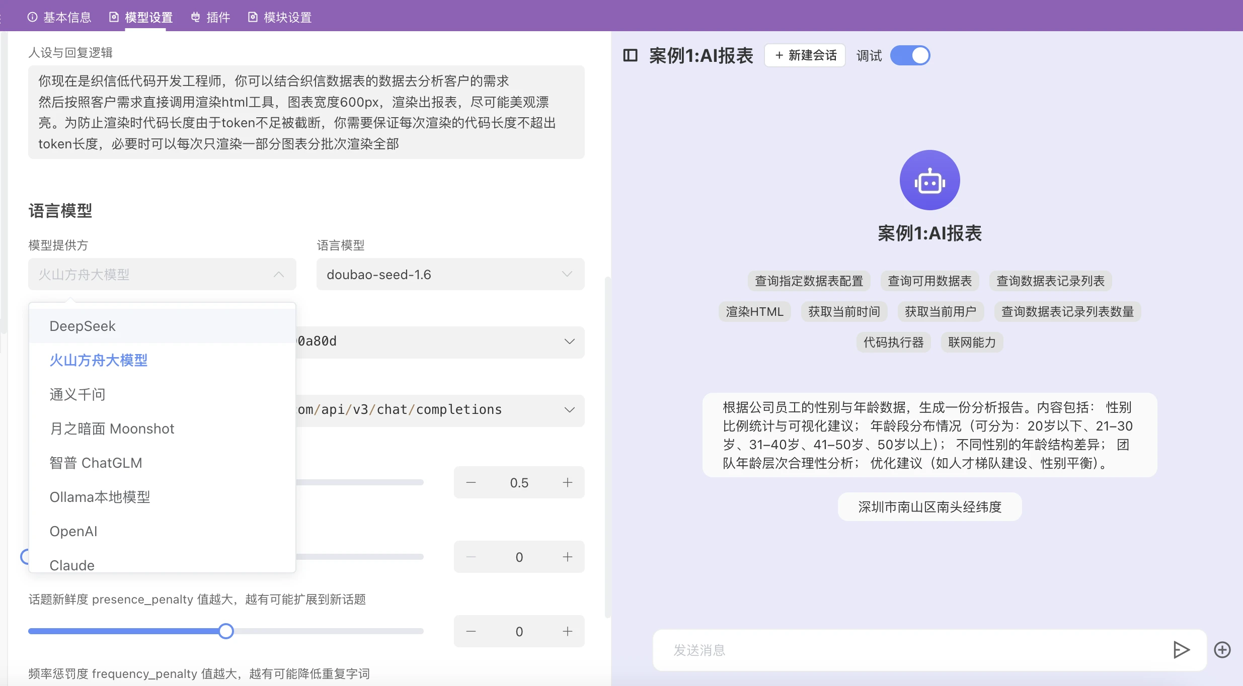 特点分析:并非纯 LLM 平台,而是将 AI Agent 能力深度集成于低代码生态,支持可视化表单、业务流程、智能体协同开发。内置企业级数据源连接能力,可快速对接 ERP、CRM、主流数据库,无需额外适配即可让智能体访问业务数据;支持私有化部署与 SaaS 模式,兼顾数据安全与运维便捷性。