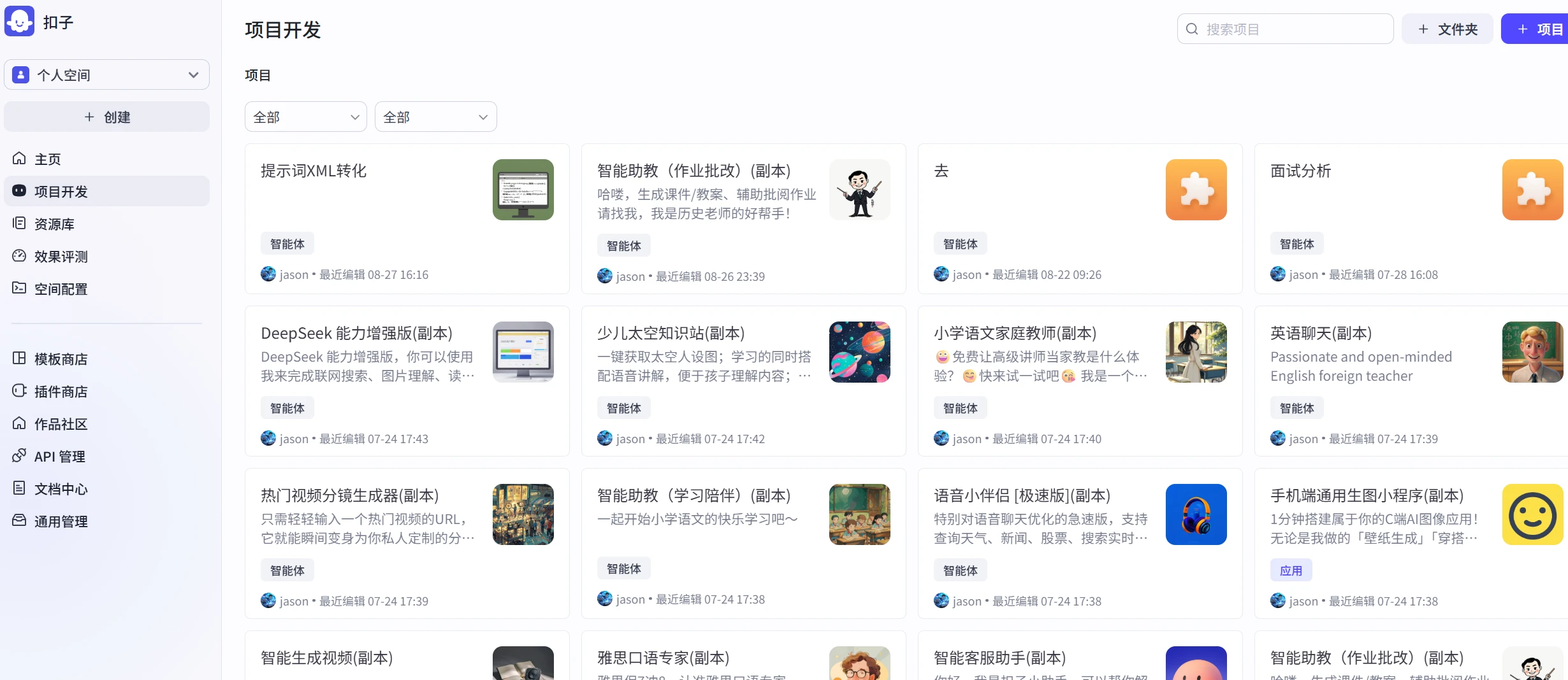 项目空间里是你的智能体仓库,这里放着你所有开发的智能体或复制的智能体 / 应用,也是在扣子进行智能体开发你最经常来到的地方。