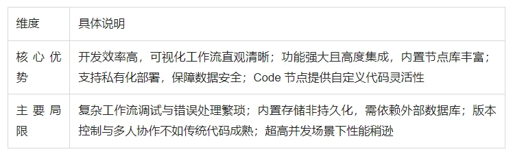 作为一个强大的低代码自动化平台,n8n 在赋能 Agent 应用开发方面表现出色,但它也并非万能。如下表所示,我们将客观地分析其优势与潜在的局限性。