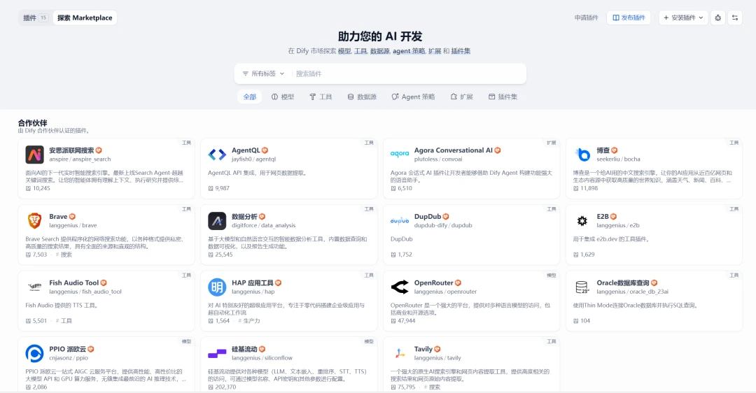 目前,Dify Marketplace 已拥有超过 8677 个插件,涵盖各种功能和应用场景。其中,官方推荐的插件包括:
