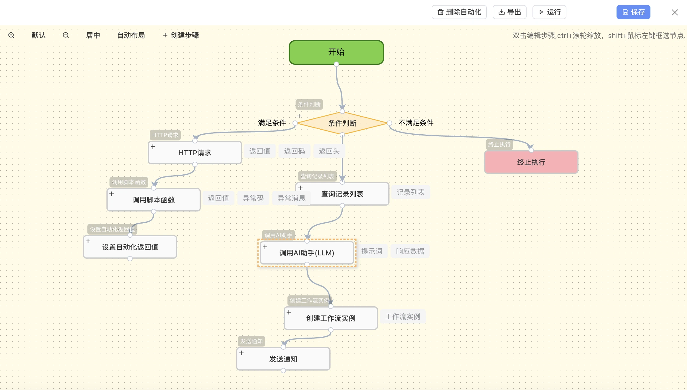 直观的可视化编排:平台提供了一个低门槛的可视化工作流编排界面,用户无需深厚的编程知识,即可通过 “拖拽” 方式构建复杂的工作流,大大降低了开发难度。