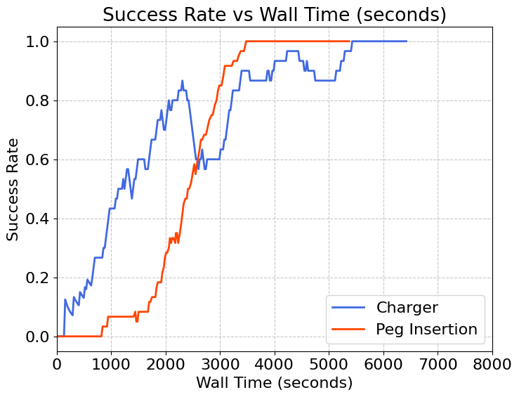 两个任务的成功率曲线如图 6 所示。可以发现,两个任务均可以在 1.5h 以内收敛。收敛后,Peg Insertion 任务可以连续 100+ 次成功,Charger 任务可以连续 50+ 次成功。