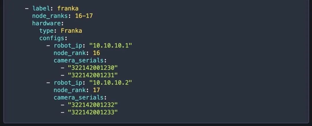 RLinf 会按照用户配置进一步完成模型与机器人的对应映射,之后 RLinf 会通过 Data Channel(RLinf 的通信原语)完成数据收集和模型参数更新。而实现这一切,用户只需要编写 YAML 文件即可完成,极大地降低了使用成本。例如,下图 2 展示了以 Franka 为例的 2 台机器人配置方法。
