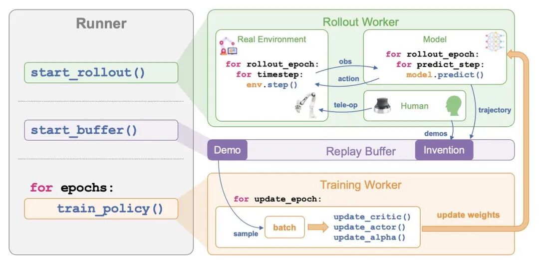 真机强化学习的一个典型局限就是物理世界无法被加速,数据效率成为显著瓶颈,所以如何提高数据利用率成为关键一环。除此之外,当下真机强化学习的一种行之有效的方法是人在环介入,例如在执行过程中提供专家示教数据,或者实时标注数据等,传统同步训推框架将会极大限制这一类方法的训练效率。