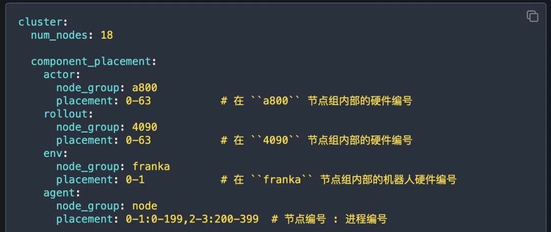 在 RLinf 中接入这样的异构环境,只需要在 YAML 配置文件中正确配置 cluster 段落即可,如下图 4 所示。
