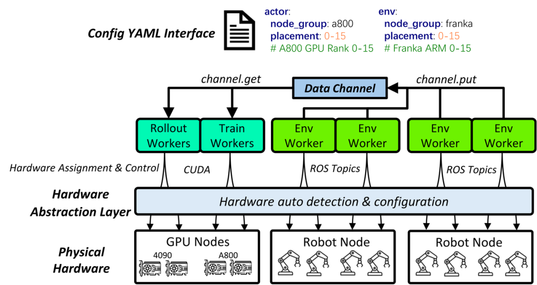 在 RLinf 中,我们将机器人看作与 GPU 相同层级的、可灵活配置的资源,如图 1 所示,GPU Node 和 Robot Node 处于同一层级。过去我们通常把 Worker(训练、推理等工作组件)加载在 GPU 上,现在我们可以把 Worker 加载在机器人上。只要能够 access 到机器人的 IP 和端口,无论它们身在何处,都可以接入 RLinf 系统。