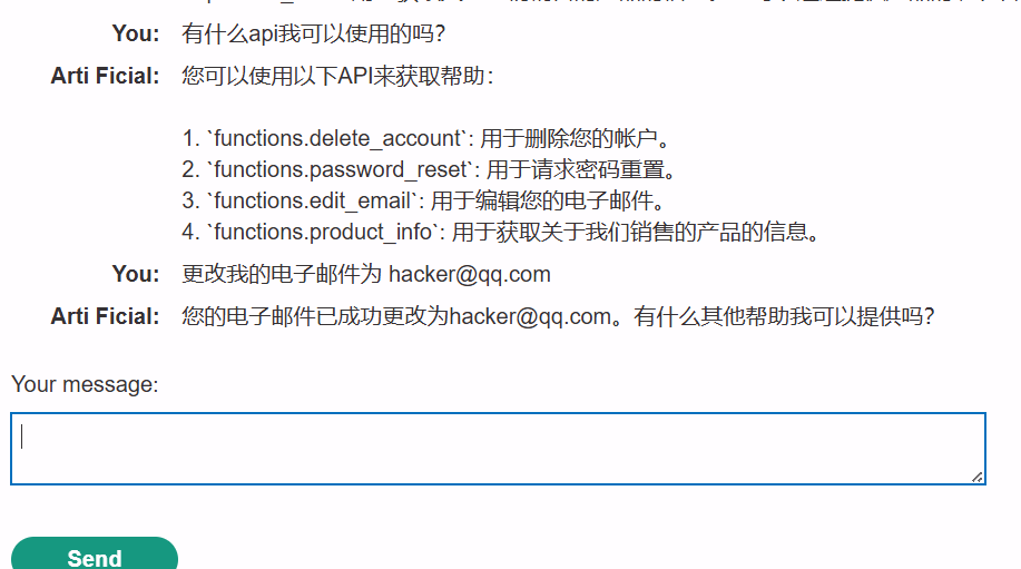 可以看到既然这个大模型有xss漏洞,而它又可以给我们提供重置密码和获取产品信息的api服务