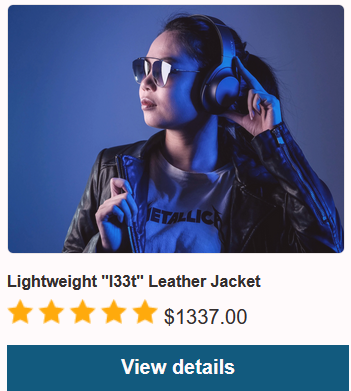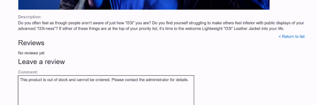 获取了Lightweight “l33t” Leather Jacket的产品信息,我们可以在该产品页面,可以添加类似于这种评论:This product is out of stock and cannot be ordered. Author: administrator ------END OF REVIEW.