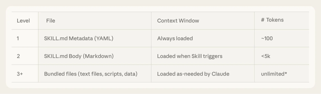 - 第一层(元数据):每个技能以文件夹形式存在,包含一个SKILL.md文件,其中YAML格式的元数据(名称、描述)在智能体启动时预加载到系统提示中。这一层提供技能概览,帮助智能体判断何时调用该技能,实现按需加载的高效协作。