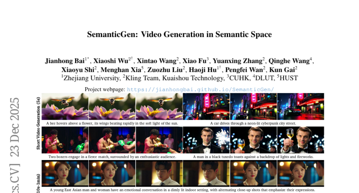 这项由浙江大学白建宏团队联合快手科技Kling团队、香港中文大学、大连理工大学、华中科技大学等机构共同完成的研究,于2024年12月发表在计算机视觉顶级会议上,论文编号为arXiv:2512.20619v1。有兴趣深入了解的读者可以通过该编号查询完整论文。这项名为SemanticGen的技术创新,彻底改变了传统视频生成"又慢又耗资源"的困境,首次实现了在高层语义空间中生成视频的突破性方法。