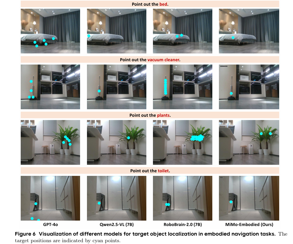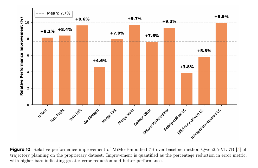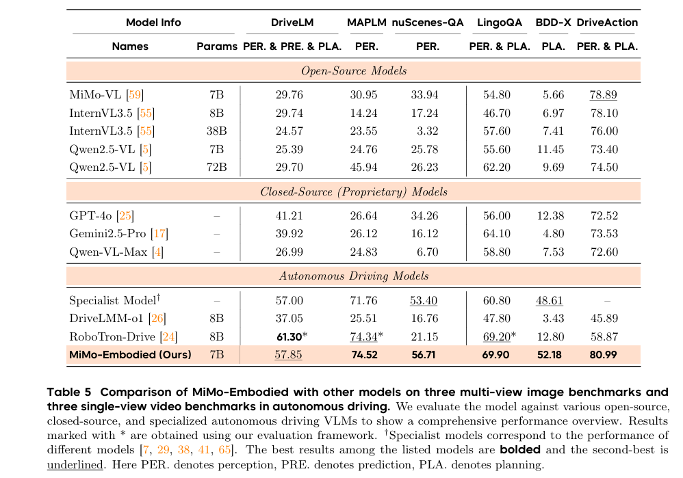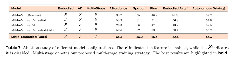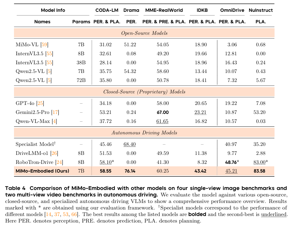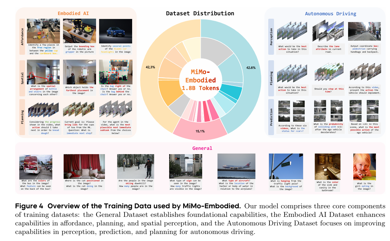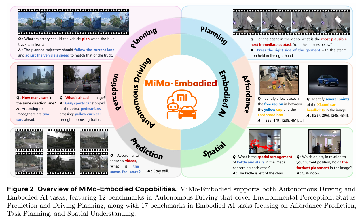 MiMo-Embodied是首个开源的跨领域统一模型:首次将自动驾驶与具身智能任务整合进单一模型,实现两大领域能力的正向迁移与相互增强。