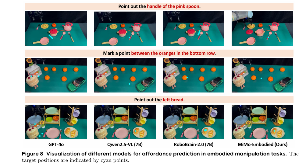 - 可用性预测:在 VABench-Point、Part-Afford 等 5 项基准中取得 SOTA,显著优于 Qwen2.5-VL、GPT-4o 等模型。