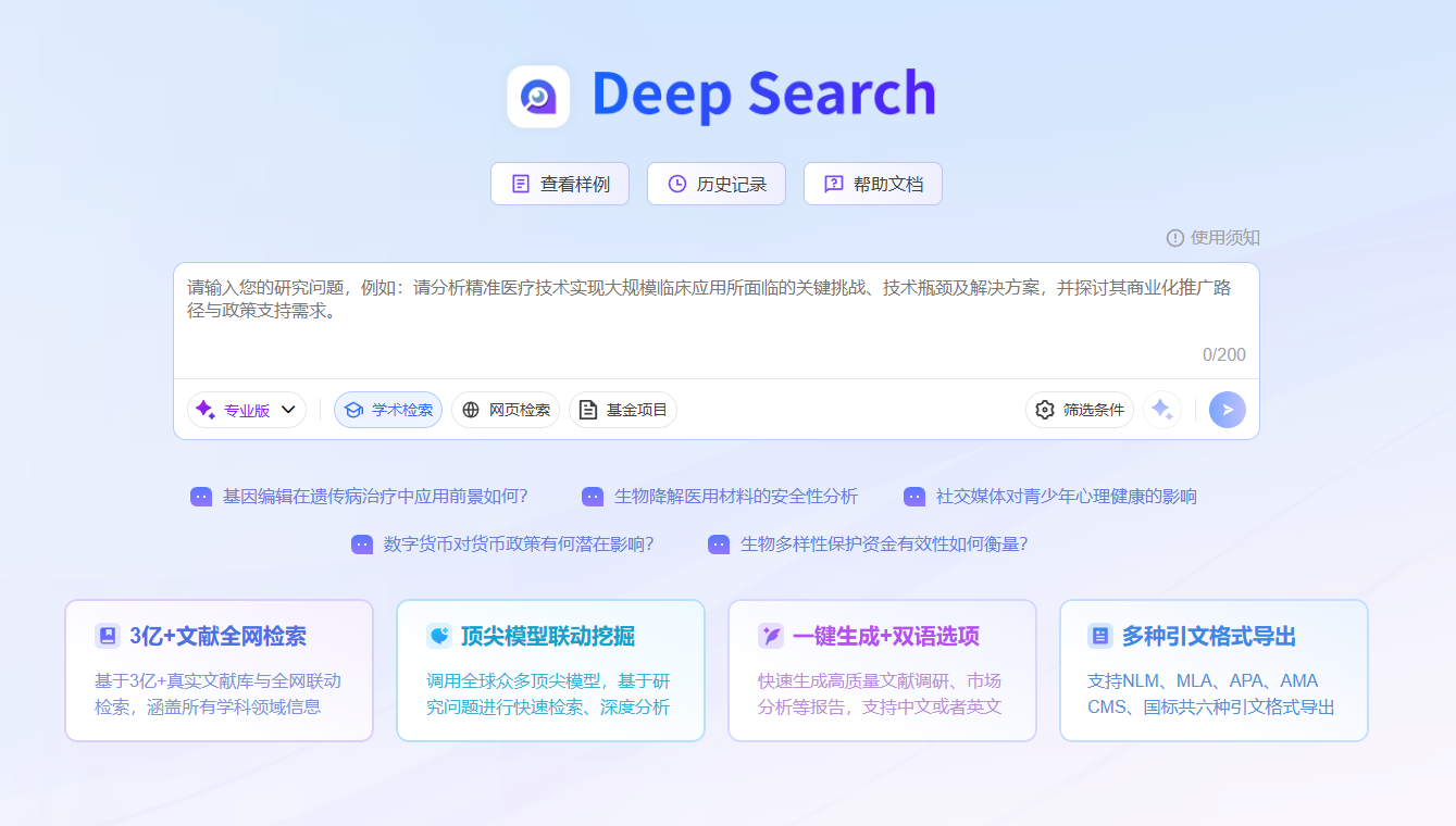 - 领域初探期:使用 Deep Search 输入研究方向,快速生成领域调研报告,把握全局态势,明确研究热点与空白,为课题立项提供支撑。