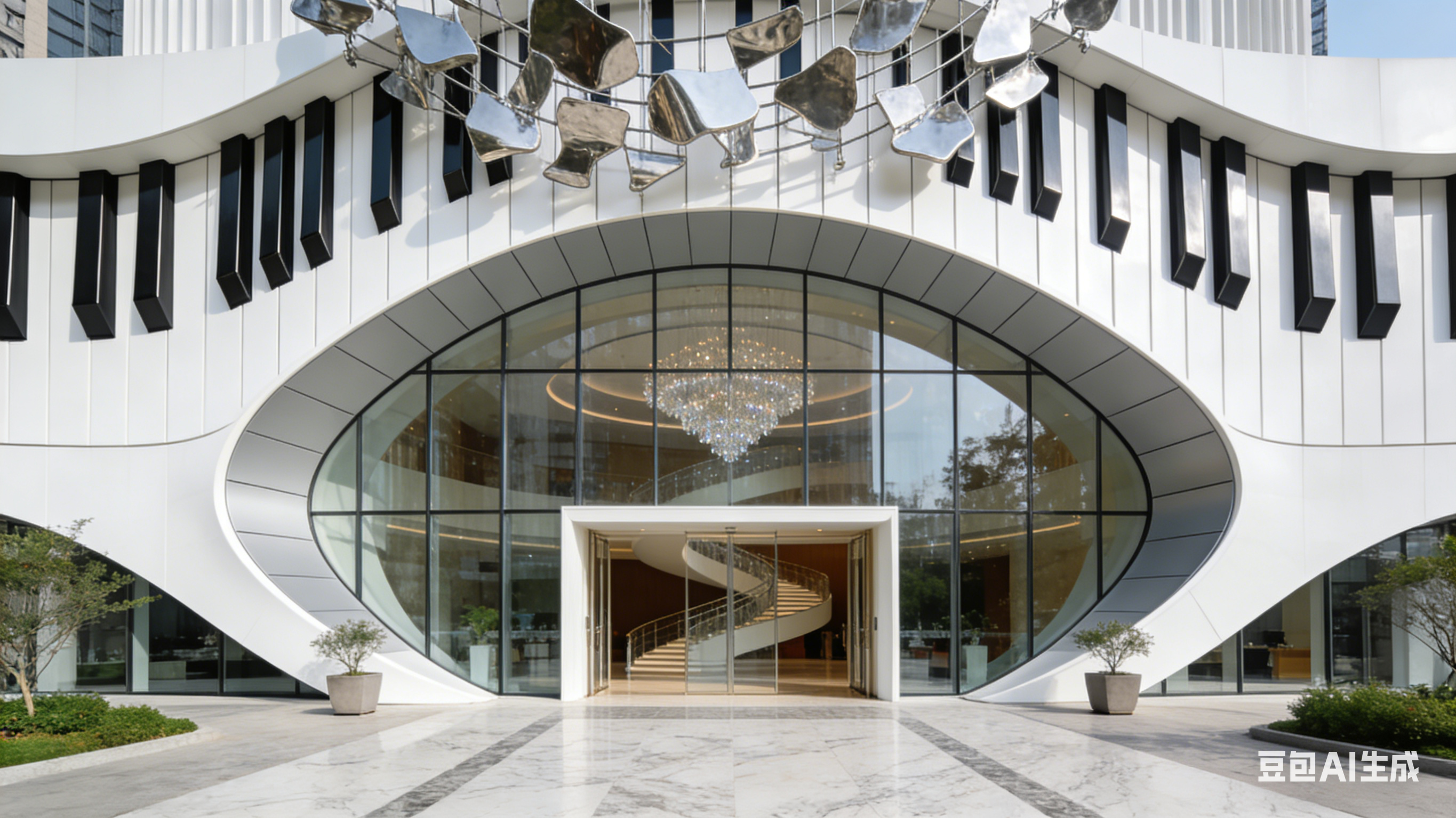 城市文化街区的时尚音乐厅,建筑造型独特,宛如一架展开的白色钢琴。外立面采用白色曲面玻璃与浅灰色铝合金板材,在阳光下呈现出柔和的光泽,曲面设计勾勒出流畅优美的线条。音乐厅的正面设有巨大的玻璃幕墙,透过幕墙能看到内部的旋转楼梯与水晶吊灯。顶部安装着不规则形状的金属装饰,如同钢琴的琴键般错落有致。入口处是开阔的门廊,地面采用大理石铺装,两侧摆放着简约的绿植景观,整体建筑时尚典雅,充满艺术气息。 |