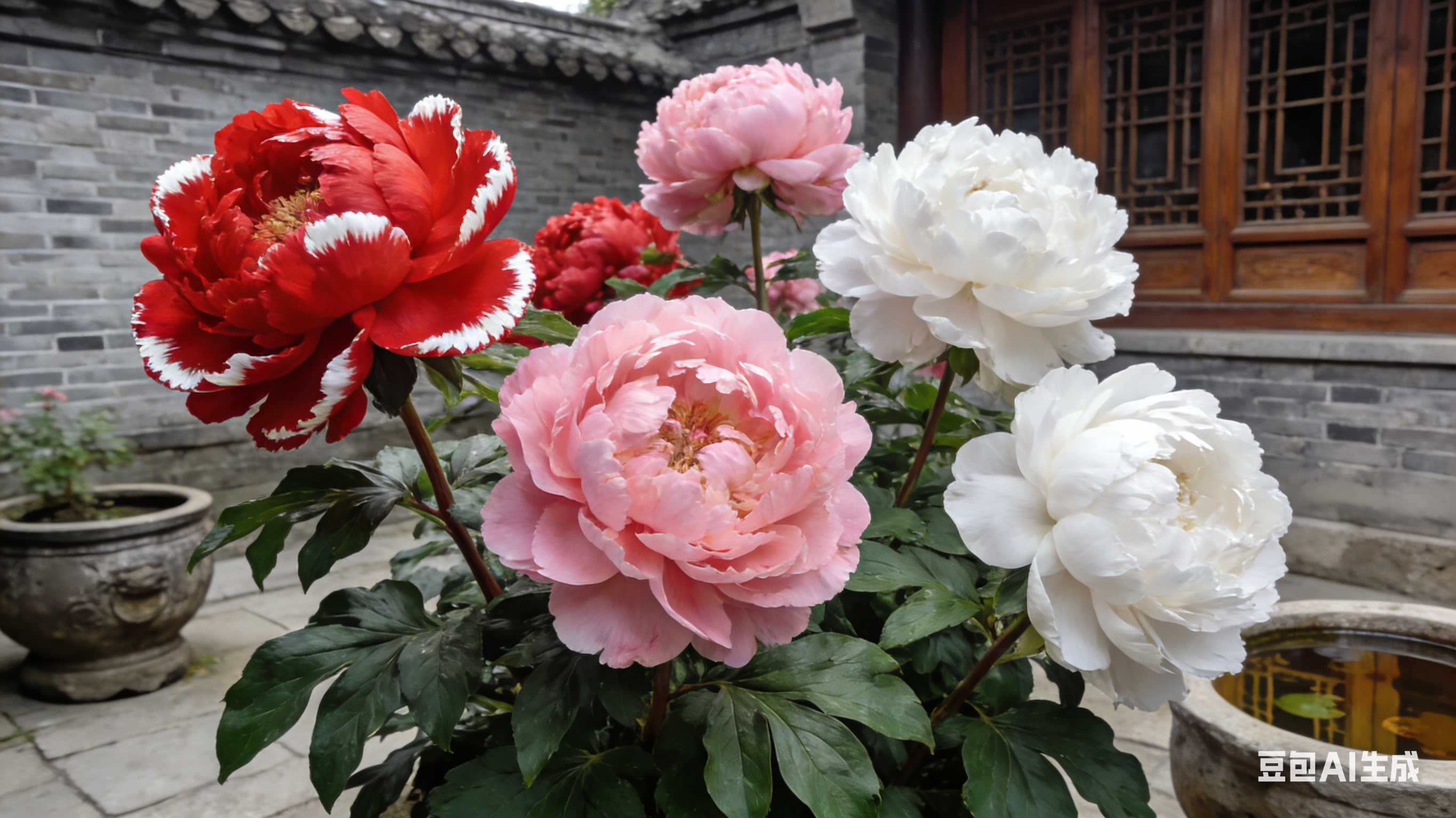 古色古香的庭院里,几株牡丹傲然绽放,花朵硕大饱满,花瓣层层叠叠,色泽艳丽夺目。有艳红色的牡丹,花瓣鲜红如霞,边缘带着细微的白边;有粉色的牡丹,色泽粉嫩娇柔,宛如少女的脸颊;还有白色的牡丹,洁白无瑕,素雅端庄。牡丹的花枝粗壮,叶片翠绿肥厚,叶脉清晰可见,衬托着娇艳的花朵。背景是灰色的青砖围墙和木质花窗,墙角摆放着古朴的石缸,缸中盛着清水,倒映着牡丹的倩影,整体画面雍容华贵,尽显牡丹的国色天香。 |