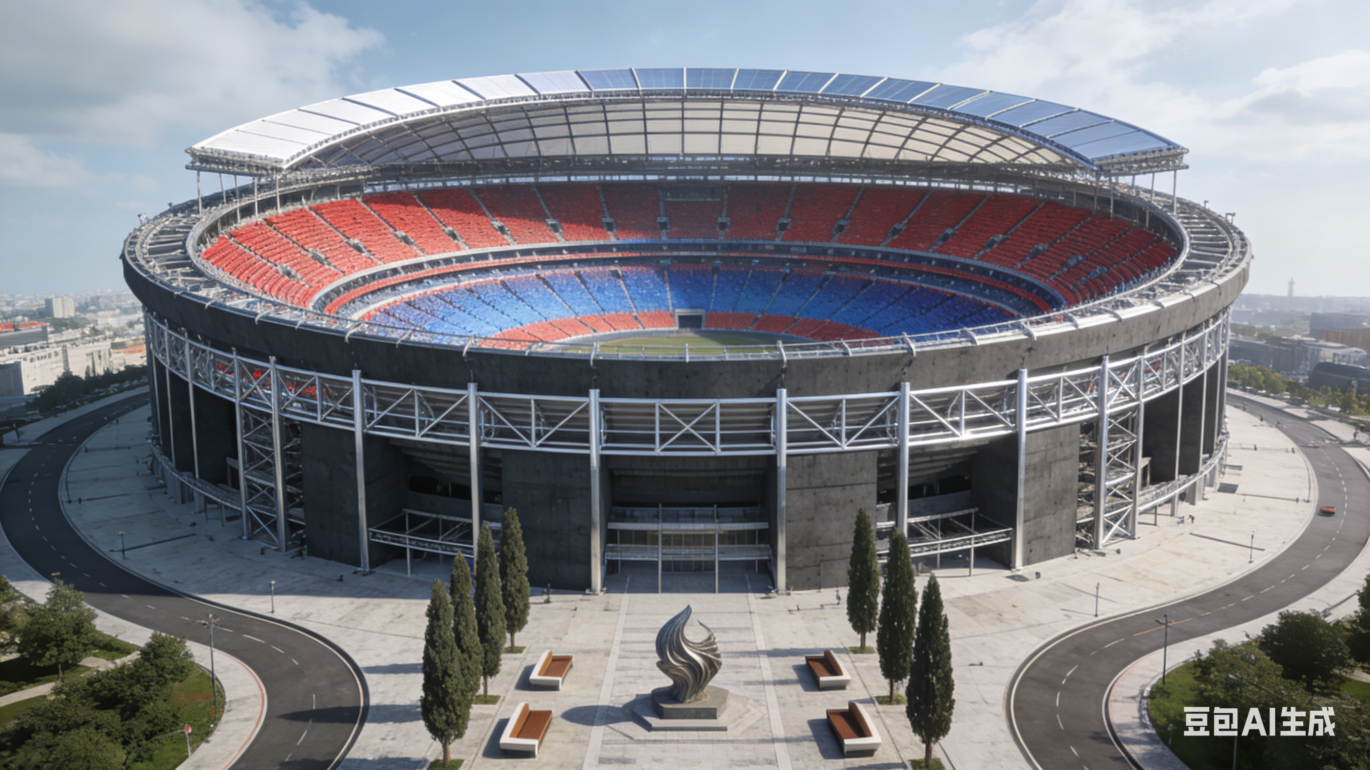 一座流线型设计的现代化体育场馆,外面采用银色与深蓝色的金属材质,在阳光下闪耀着未来科技的光芒。巨大的穹顶采用透明材料,自然光与内部LED照明交 相辉映,营造出既明亮又梦幻的空间感。场馆外立面装饰着动态变化的LED屏幕,正播放着赛事预告及与观众互动内容,展现着现代体育的活力与魅力。入口处, 流线型的玻璃门与智能识别系统融为一体,彰显着科技与便利的完美结合。 |
