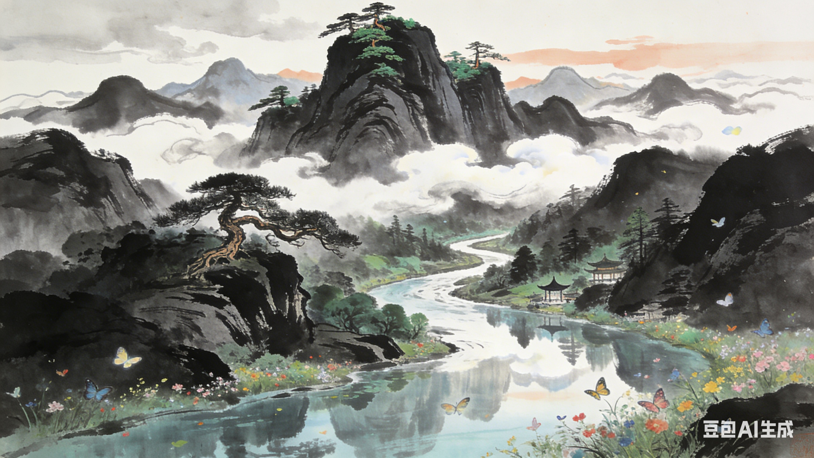 画面缓缓展开,首先映入眼帘的是一座巍峨挺拔的主峰,它矗立于画面中央偏上位置,山峰层峦叠嶂,云雾缭绕其间,仿佛是天与地的交界,既神秘又庄严。山 峰之上,古松苍翠,枝干虬曲,展现出顽强的生命力。它们或立于峭壁之上,或隐于云雾之间,为这静谧的山林增添了几分生气。 随着视线下移,一条蜿蜒曲折的溪流从山间潺潺流出,溪水清澈见底,倒映着两岸的青山绿树,以及天空中飘浮的几朵白云。溪边,野花烂漫,彩蝶飞舞,一片 生机勃勃的景象。溪流旁,隐约可见几处亭台楼阁,它们或依山而建,或临水而居,与自然景观融为一体,彰显出古代文人雅士追求自然和谐的生活态度。 在画面的远处,群山连绵,云雾缭绕,形成了一幅幅动人的水墨画卷。这些远山虽不及主峰那般雄伟,却以它们独特的姿态和色彩,为整幅画面增添了层次感和 深度。同时,远处的天空也被染上了淡淡的墨色,与群山相呼应,营造出一种宁静而深远的氛围。 整幅画面以墨色为主,辅以淡彩,通过浓淡干湿、疏密曲直的笔墨技法,将中国山水画的意境之美展现得淋漓尽致。观者仿佛能够穿越时空,置身于那片古老而神秘的山水之间,感受那份来自心灵深处的宁静与和谐。 |