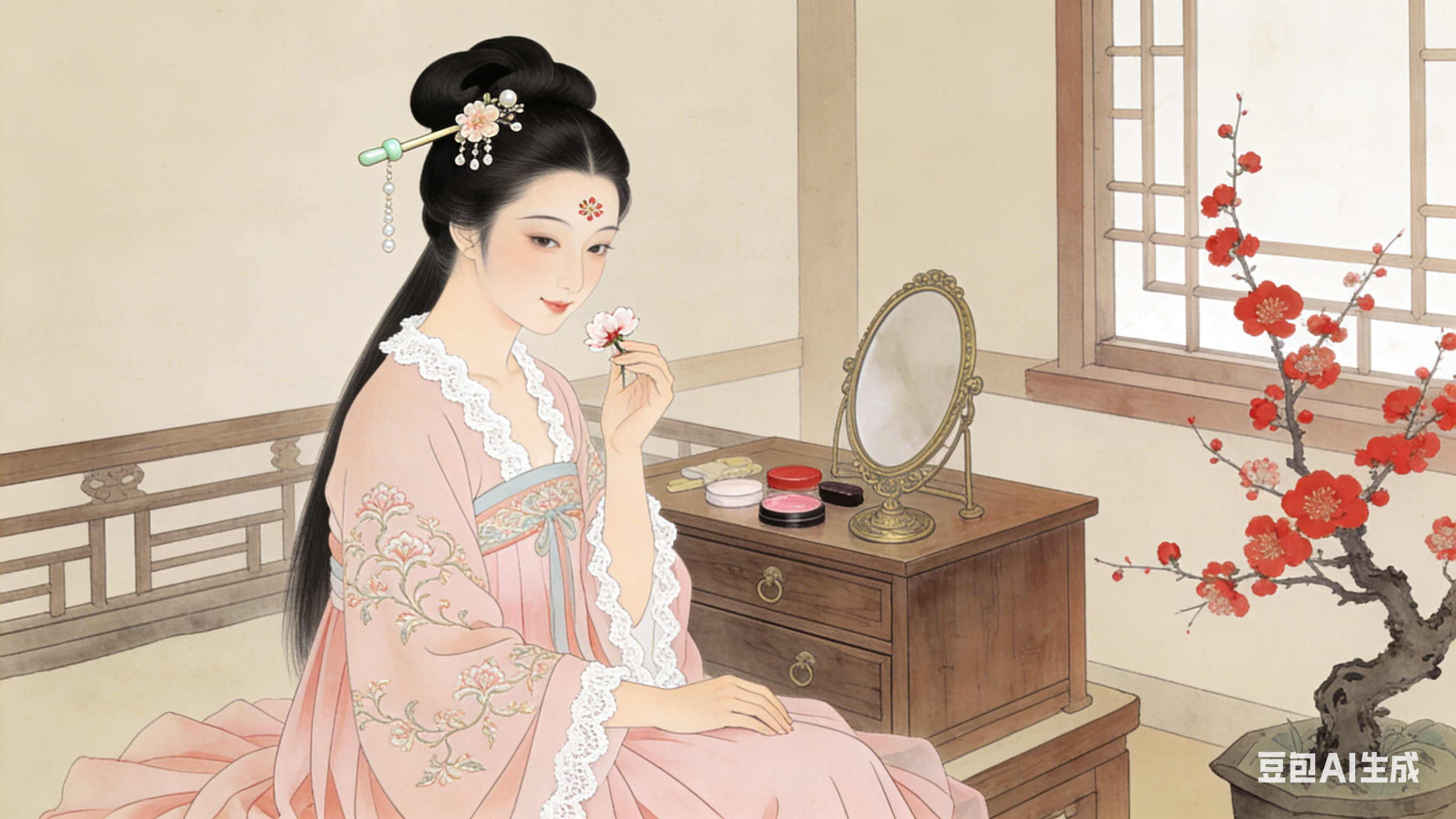 古代仕女图,画面中的仕女身着淡粉色襦裙,裙摆层叠,上面绣着精致的缠枝莲纹样,领口与袖口点缀着白色蕾丝边。仕女梳着高髻,发髻上插着一支玉簪与几朵珠花,发丝乌黑顺滑,额前贴着小巧的花钿。她侧身而坐,姿态优雅,右手轻拈一朵梅花,左手放在膝上,眼神温柔婉约,嘴角带着淡淡的笑意。背景是一间雅致的闺房,屋内摆放着木质梳妆台,台上放着铜镜、胭脂水粉等物品,窗边种植着一株红梅,枝头绽放着鲜艳的梅花,整体画面温婉柔美,尽显古代仕女的典雅气质。 |