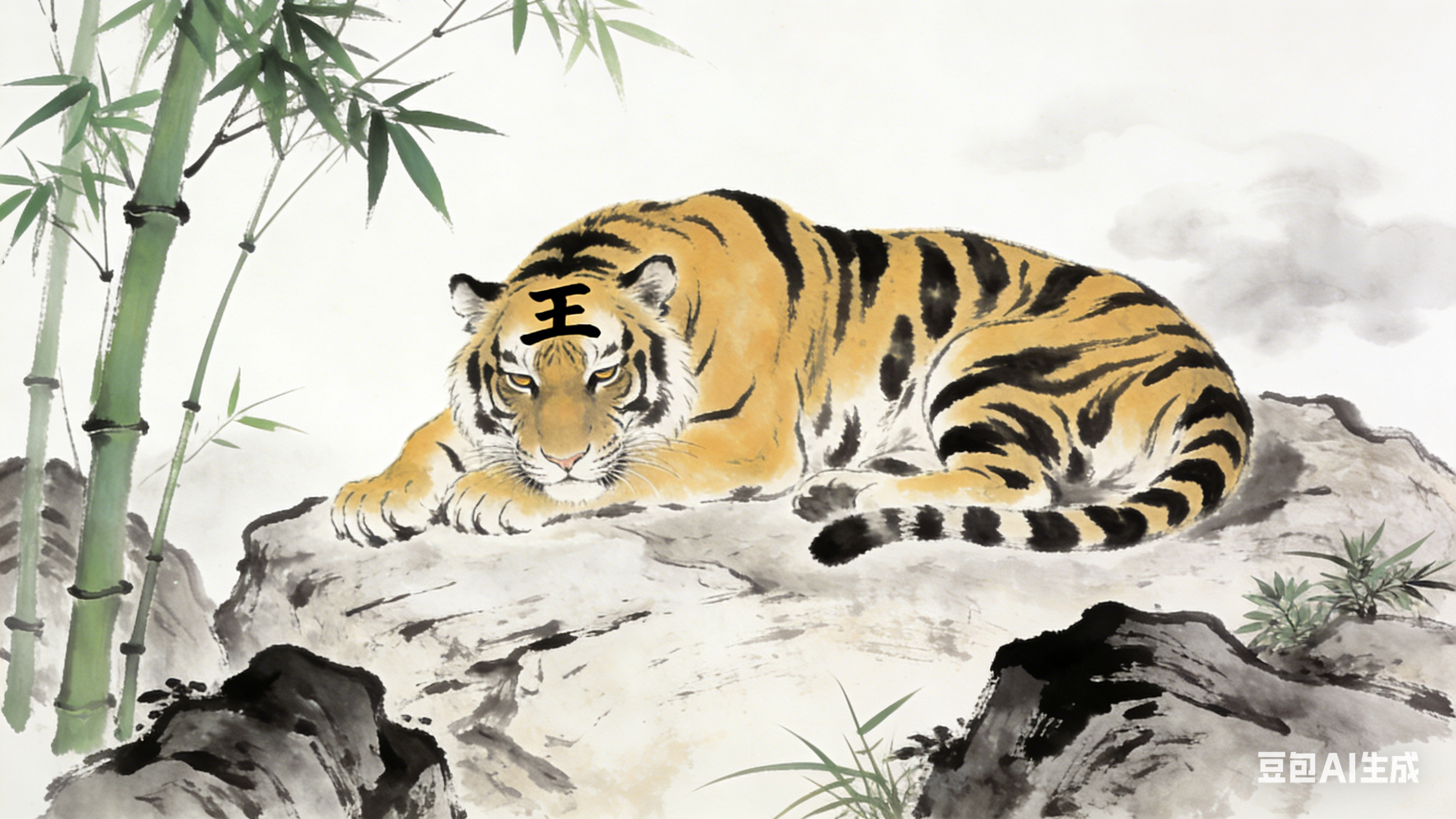 国画风格的老虎图,画面中央是一只雄健的老虎,正趴在岩石上小憩。老虎身躯健壮,肌肉线条饱满,皮毛以浓淡不一的黄色渲染,黑色的斑纹清晰分明,笔触遒劲有力。虎头微微低垂,双眼半睁半闭,神情威严而不失沉稳,额头上的 “王” 字纹路清晰,彰显王者之气。老虎身下的岩石以淡墨勾勒,纹理粗糙自然,周围点缀着几株翠竹与山石,翠竹枝干挺拔,叶片翠绿,以简笔勾勒,与老虎的浓墨重彩形成对比。背景以留白为主,仅用淡墨渲染出淡淡的云雾,整体画面简洁大气,尽显老虎的威严与霸气。 |