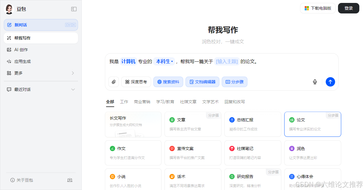 豆包AI论文写作工具不仅能够提高工作效率,还能有效提升文章质量。使用这款AI写论文工具时,你会发现它不仅能准确理解你的需求,还能创造性地提出新颖的观点或论据来丰富内容。这意味着即使面对复杂的学术话题,你也能够借助于豆包的AI生成论文功能轻松应对。更重要的是,该AI论文生成平台提供了丰富的模板选择以及灵活的定制选项,让你可以根据个人喜好调整格式风格。这样一来,在保证专业性的同时也增添了个性化色彩。此外,考虑到版权问题,豆包AI论文写作工具特别注重原创性检测,确保每份由其产生的文档都是独一无二的。总之,无论你是正在准备毕业论文的学生,还是希望发表更多高质量作品的研究人员,豆包都将成为你不可或缺的好帮手。