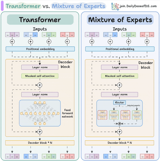 - 核心思想:将模型拆分为多个专家子网络(如FFN),每层动态激活部分专家(通过门控机制),显著扩展模型规模而不增加计算量。