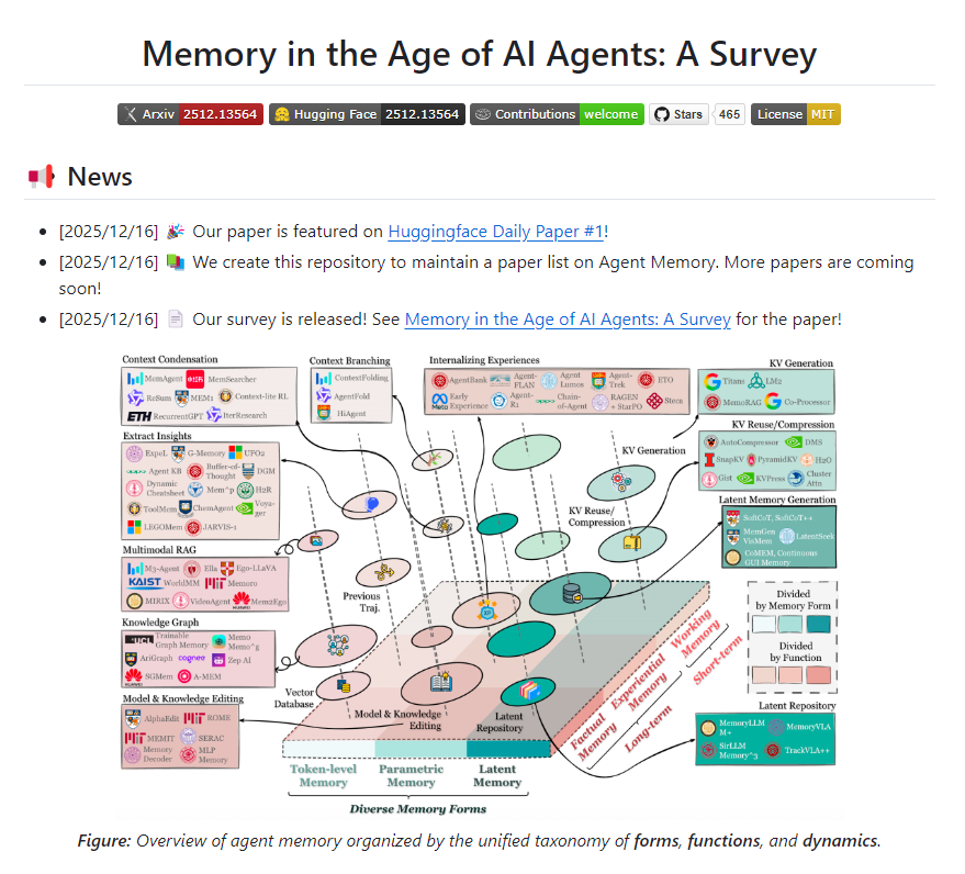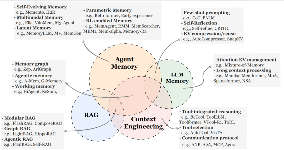 近日,来自新加坡国立大学、中国人民大学、复旦大学、北京大学等顶级学术机构共同撰写并发布了百页综述《Memory in the Age of AI Agents: A Survey》,旨在将智能体记忆与 RAG 和上下文工程等相关概念区分开来,并通过三个统一的视角提供全面的概述: