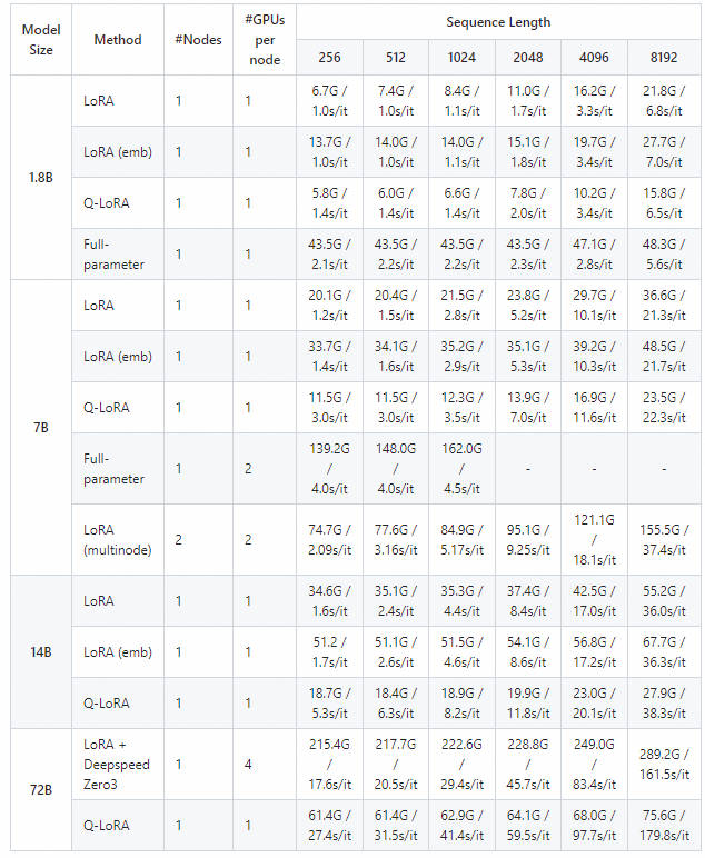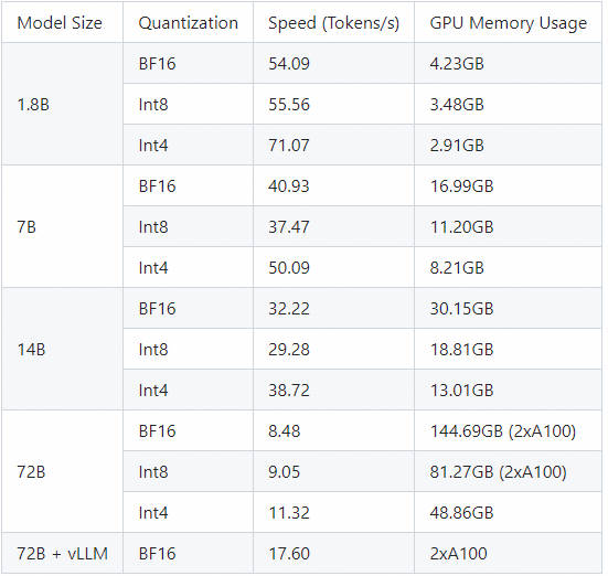 测量了使用BF16、Int8和Int4中的模型生成序列长度(Sequence Length)2048的平均推理速度和GPU内存使用情况。