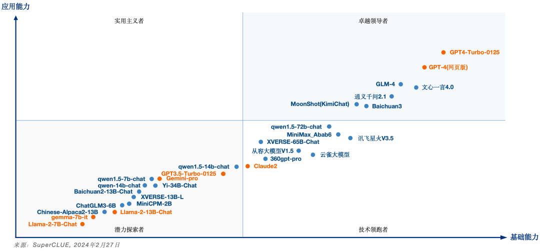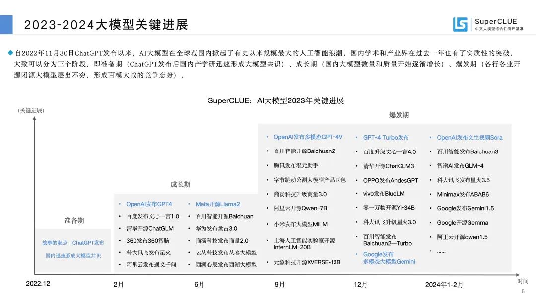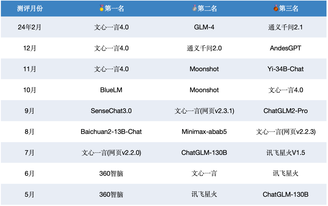 SuperCLUE月榜首位的大模型有5个。分别是文心一言、BlueLM、SenseChat3.0、Baichuan2-13B-Chat、360智脑。其中,百度的文心一言登顶SuperCLUE月榜的次数最多,分别在7月、11月、12月、24年2月取得了SuperCLUE最好成绩。
