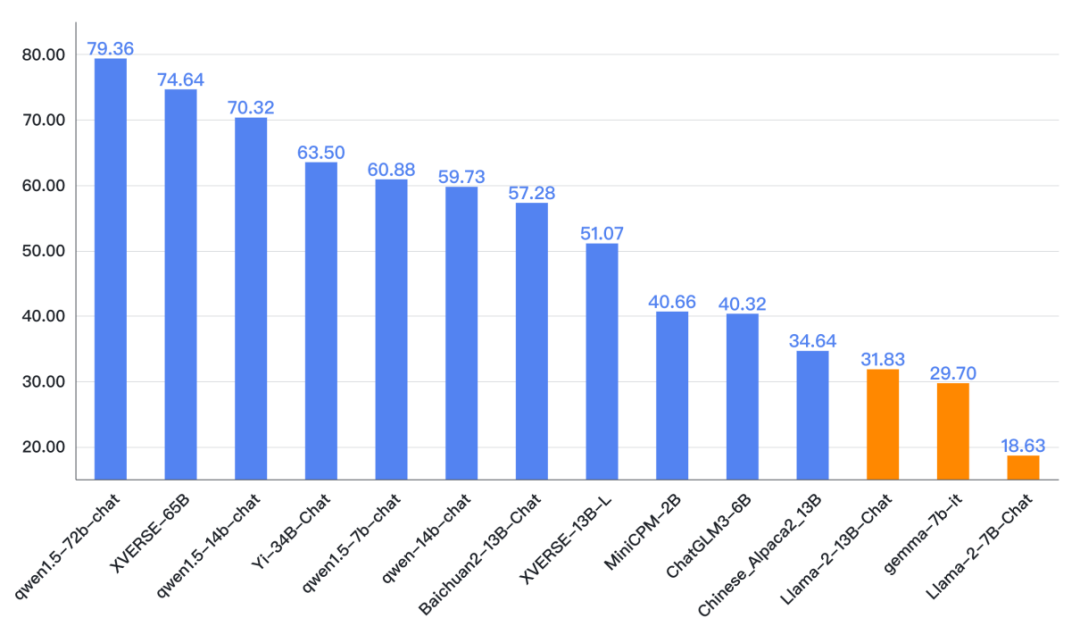 总体上大版本(如34B)的模型优于中小版本(13B、6B)的开源模型,更大的版本(如72B)的模型表现要更好。但也有小模型好于大模型的情况,如qwen1.5的70亿参数版本好于一些130亿参数的大模型,面壁智能的MiniCPM-2b好于智谱AI的ChatGLM3-6B