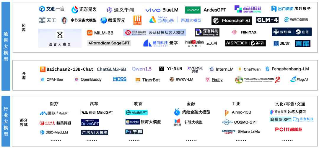 大厂中开源的主导力量是阿里云,在各个参数量级中国都有模型开源。但众多的创业公司是开源模型的主力,如智谱AI、百川智能、零一万物、元象科技、面壁智能。