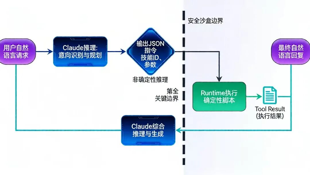 :Claude进行规划与推理,但绝不直接执行代码。它仅输出一个结构化的JSON对象,其中包含要调用的技能ID、函数名和参数。这确保了模型行为的确定性和可预测性。