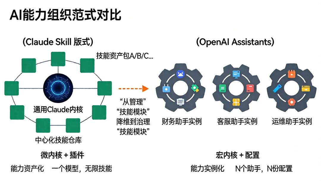 :更接近“宏内核+配置”架构。每个Assistant都是一个相对独立的实例,其能力(通过Function Calling或知识库)在创建时被定义和绑定。要扩展或修改能力,通常需要创建新的Assistant或修改现有Assistant的配置。这导致了能力的碎片化和复用困难。