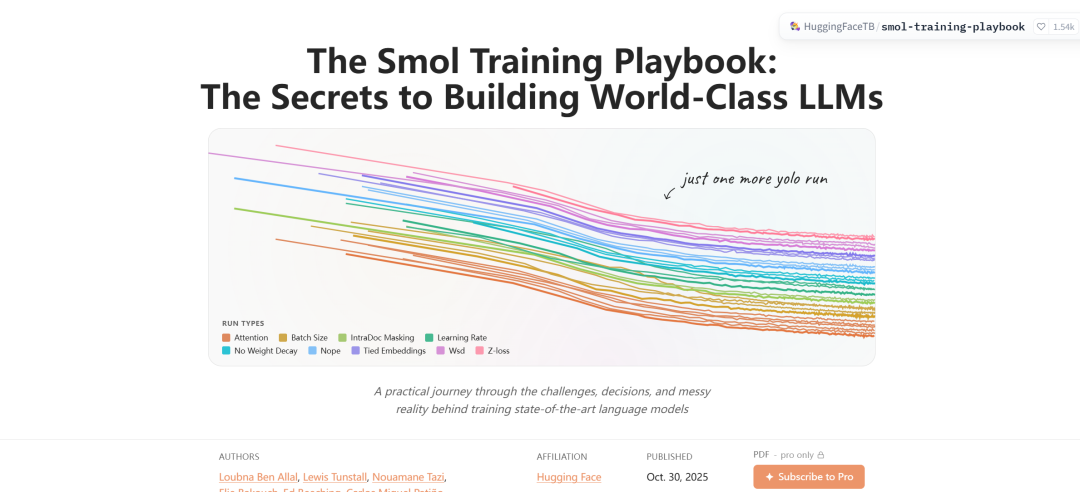 《The Smol Training Playbook: The Secrets to Building World-Class LLMs》由 Hugging Face 团队于 2025 年 10 月 30 日发布,详情见https://huggingface.co/spaces/HuggingFaceTB/smol-training-playbook,聚焦SmolLM3(3B 参数多语言推理模型,训练于 11T tokens) 的训练实践,揭示了训练顶尖 LLM 的真实挑战与关键决策。内容涵盖从训练指南针(明确 “为何训练”“训练什么”“如何训练”) 到架构设计(注意力机制、嵌入共享、位置编码等)、优化器与超参数选择(AdamW 为主流、WSD 学习率调度等)、数据筛选与混合(多语言、数学、代码数据的平衡)、训练过程中的问题排查(吞吐量下降、损失异常等)、后期训练(SFT、偏好优化如 APO)及基础设施搭建(GPU 选型、存储配置、节点监控等),强调系统性消融实验、增量验证修改、灵活应对训练故障的重要性,旨在缩小研究与生产差距,为 LLM 训练提供实用指南。