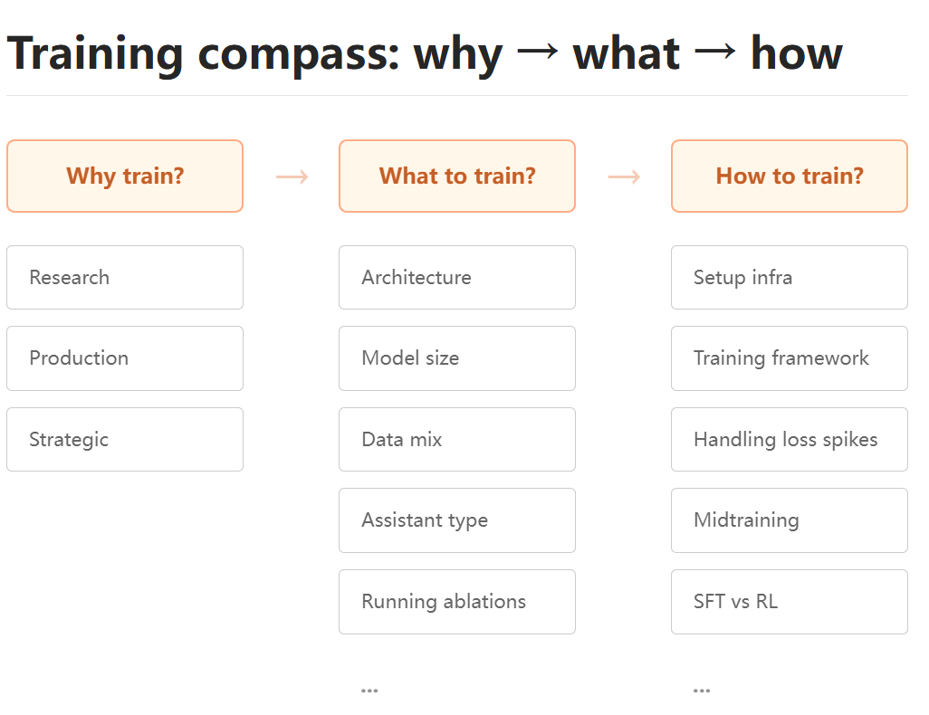 - 明确目标,避免无意义训练:用 “训练指南针” 筛选目标,优先选择 “填补开源空白”(如 “3B 端侧多语言模型”)或 “解决特定生产痛点”(如 “垂直领域小模型”),排除 “有算力就训练”“跟风追 SOTA” 等无效目标。