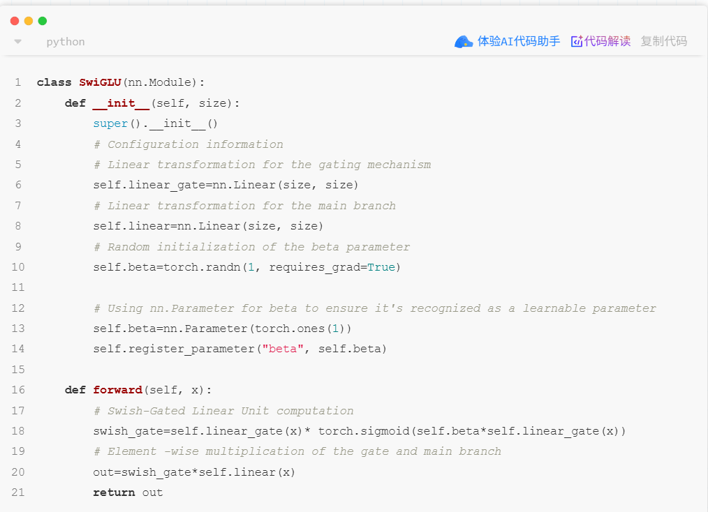 SwiGLU 的优势在于其门控机制,它允许模型学习哪些特征是重要的。通过将主分支的输出与门控信号相乘,模型可以: