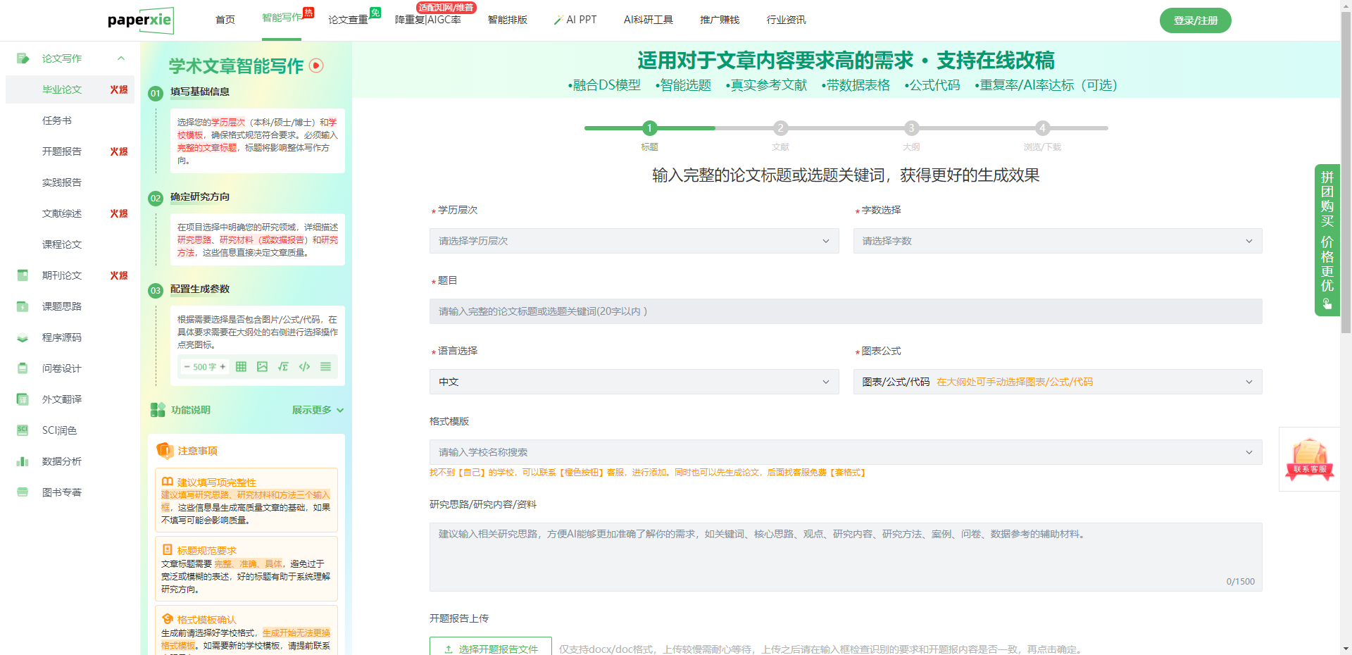 在 “研究思路 / 研究内容 / 资料” 输入框中,你需要明确:核心关键词是什么?用什么研究方法?有没有参考案例或数据? 比如你想写 “短视频对大学生消费行为的影响”,可以在这里补充 “以某高校为例 + 问卷调查法 + 参考《2024 短视频用户行为报告》”。这些信息会被 DS 模型拆解为 “研究背景 - 问卷设计 - 数据统计 - 结论建议” 的逻辑链,生成的内容不会是空泛的 “套话”,而是带着具体案例和方法的 “落地性内容”。