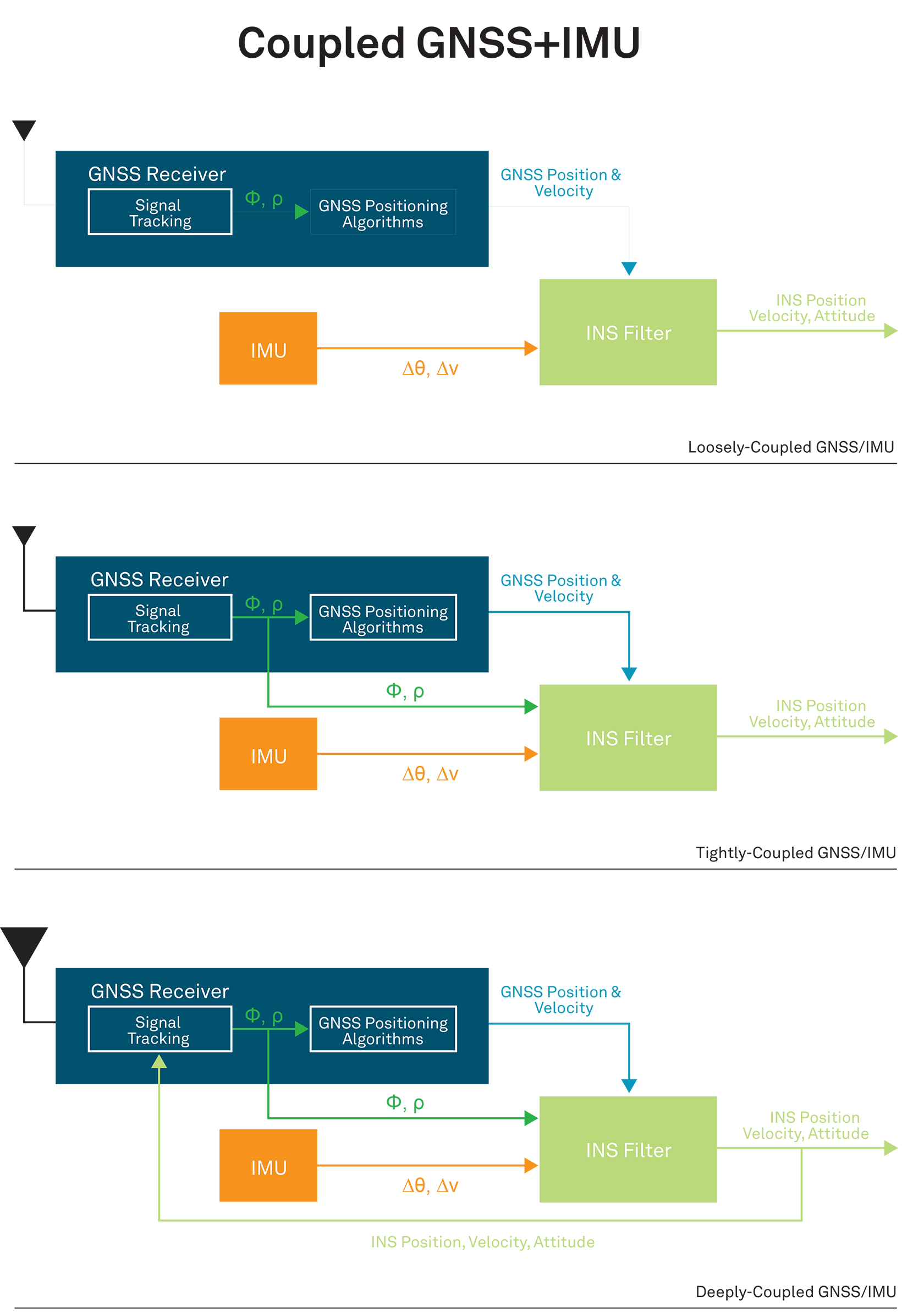 GNSS 基带处理(如相位解算)与 IMU 融合在同一芯片内部完成,误差模型更紧密。 |