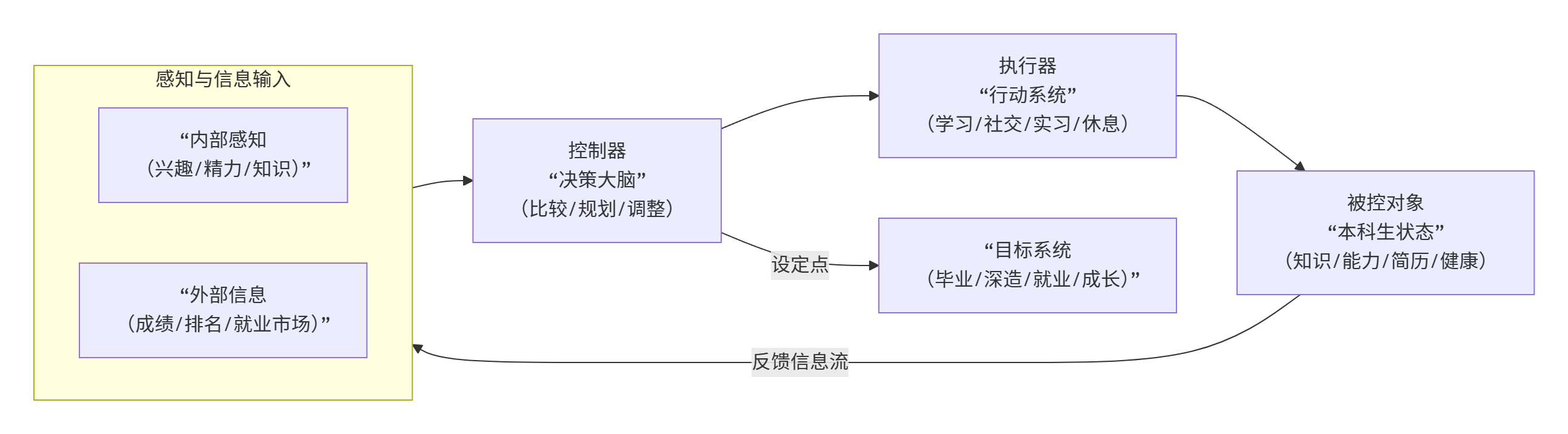 好的,这是一个非常精彩的应用问题。我们可以将一名本科生视为一个复杂的、有目标的、自适应的控制系统,并用控制论的核心原理对其行为进行分析。