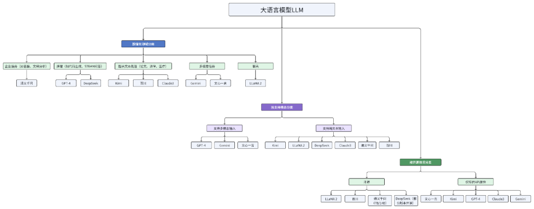 如下图所示,我将大模型按照擅长的领域、支持的模态以及开源情况进行了分类: