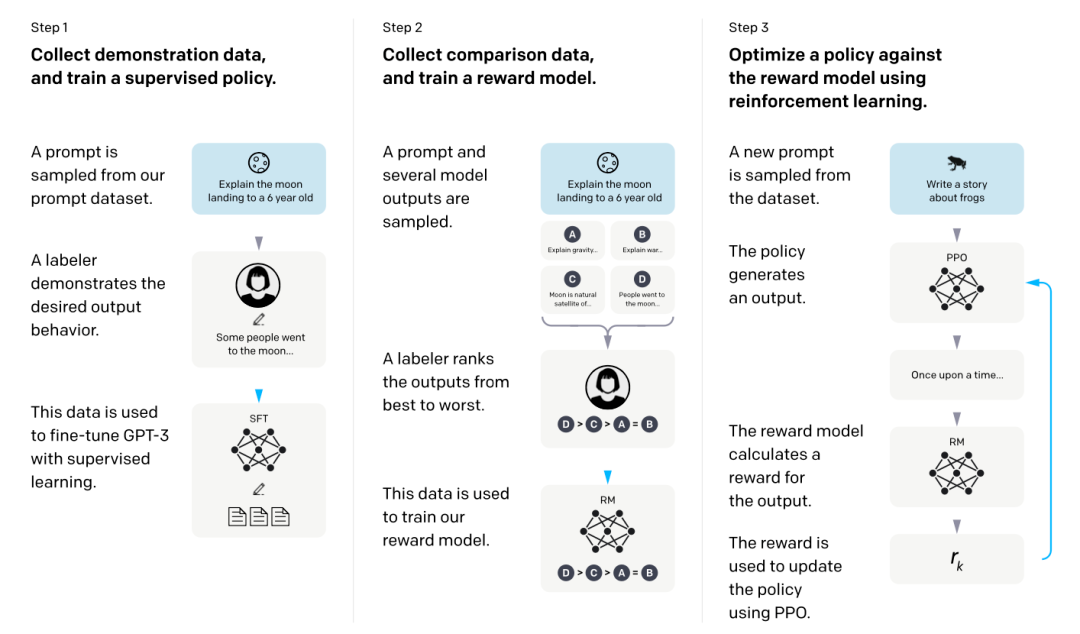 首个将强化学习引入大模型训练的开创性工作是 Training language models to follow instructions with human feedback(2022),该研究采用 PPO 算法实现模型输出与人类意图的对齐,从而催生了 InstructGPT。