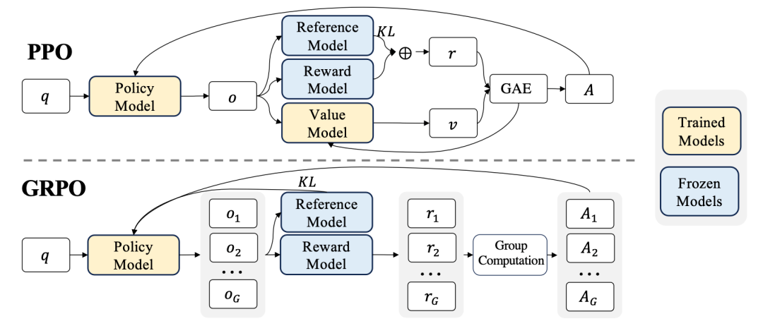 二者的核心差异在于:PPO依赖模型自身对奖励期望的预测值作为基准,而GRPO则完全基于采样结果经由奖励模型评分后所得的统计量来构建基准。