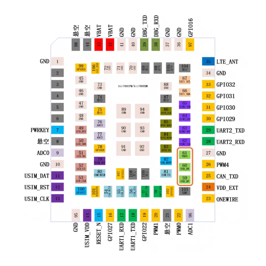 Air780EPM系列模组与USB相关的管脚,如上方管脚图右侧浅绿色块所示: